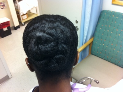After washing and conditioning, I used castor oil or olive oil. Smooth my hair into a ponytail. Make six twists from the ponytail. I use a little Curls Creme Brûlée on my ends as well to get the twistout texture for the bun. In the morning when it’s dry, I tuck the ends. Voila! Every night I moisturize and retwist the ponytail. I don’t comb it out or anything.
