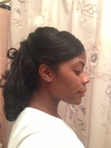For the wedding, I started with freshly washed hair. I roller set it and then straightened it a bit more with the curling iron. I was sure to use a lot of heat protectant/straightening serum to ensure that it wouldn’t frizz. The effect of that was looser curls. I applied some WonderCurl Butter Than Love Hair Pudding and did 4 Bantu knots. Two in the front and two in the back. That has proven to be a great moisturizer for my hair. In the morning, I took the Bantu knots down and pinned up one side.