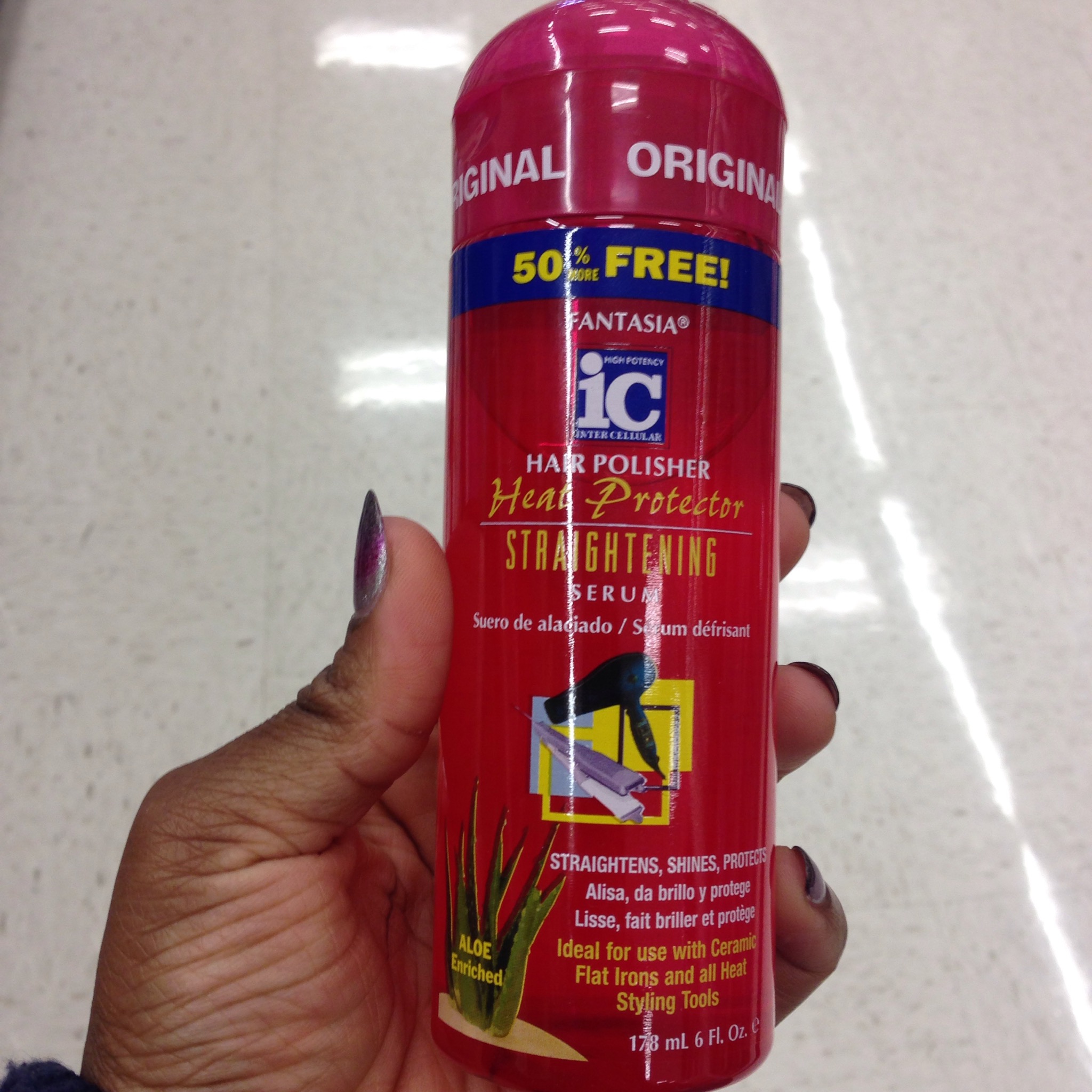 I use Fantasia IC Straightening Serum and heat protectant. I’ve been using this for years and it’s the one heat protectant I absolutely love. I part small sections at a time to flat iron and apply the heat protectant to each parted section just before I flat iron it. I do about 3 passes per section.