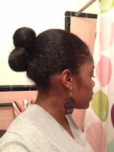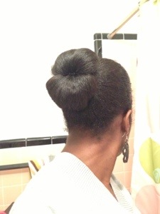 I randomly tried a different bun today. I wasn’t sure how I felt about it, but I just kept it in anyway. I thought it was cute from the back, but from the side it looks like two puckering lips. =)