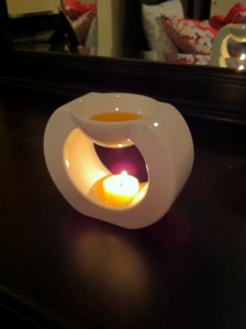 This is the White Gaia Fragrance Warmer. I’m burning a Banana Leaf scented tealight with a Banana Leaf “Scent Plus Melts” on the top. The “Scent Plus Melts” completely liquify, they’re very fragrant and can burn for what seems like forever (80 hours of burn time).